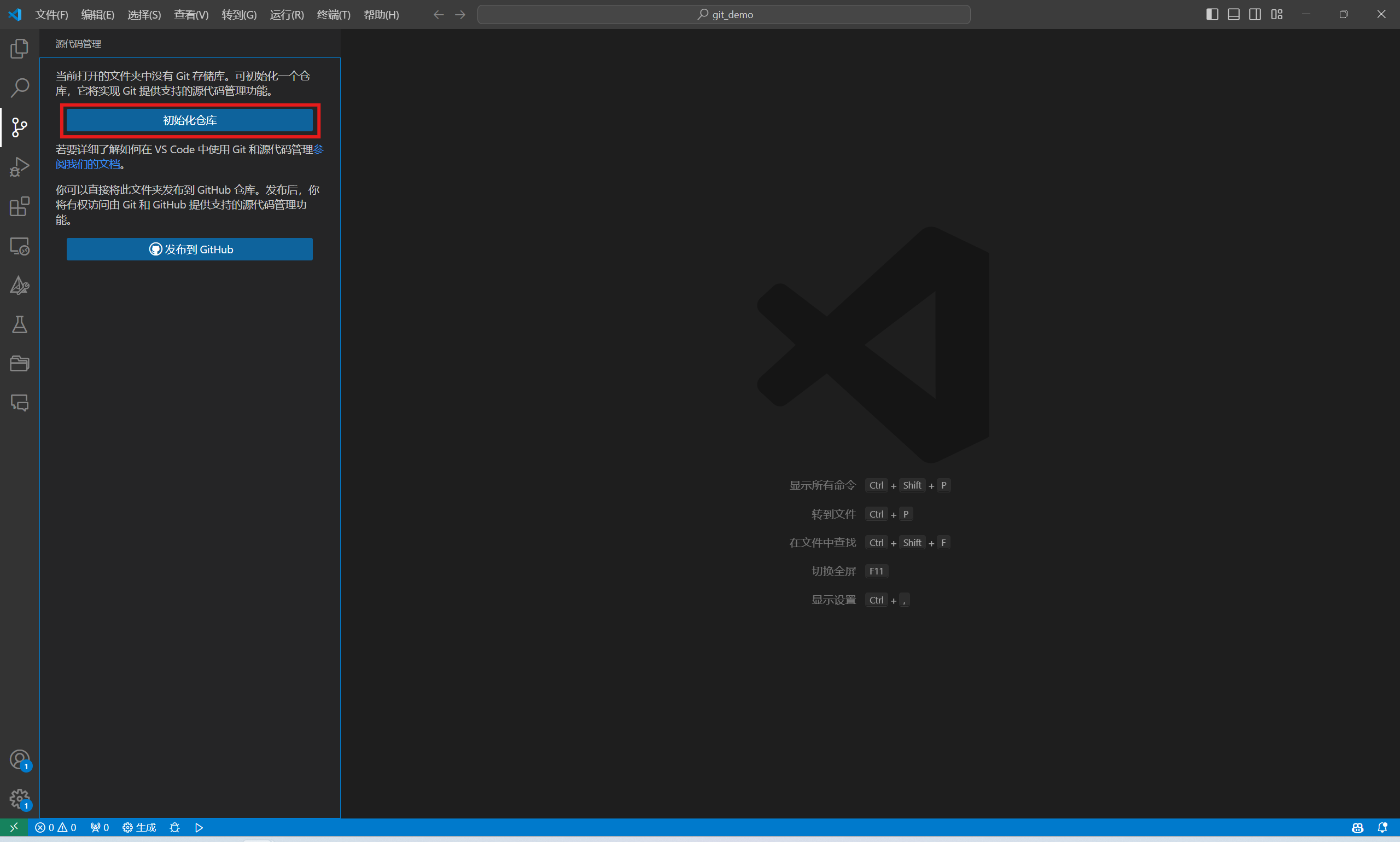 在使用 Git 进行代码管理前需要进行仓库的初始化,可通过 VSCode 打开项目后,选择"源代码管理",然后点击"初始化仓库"实现。