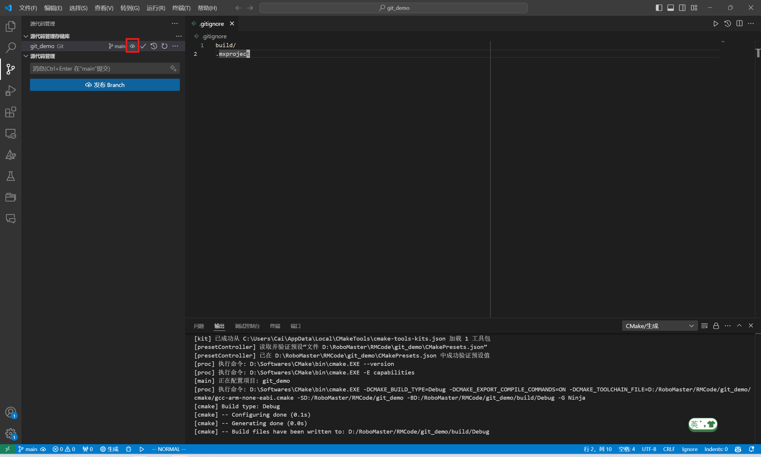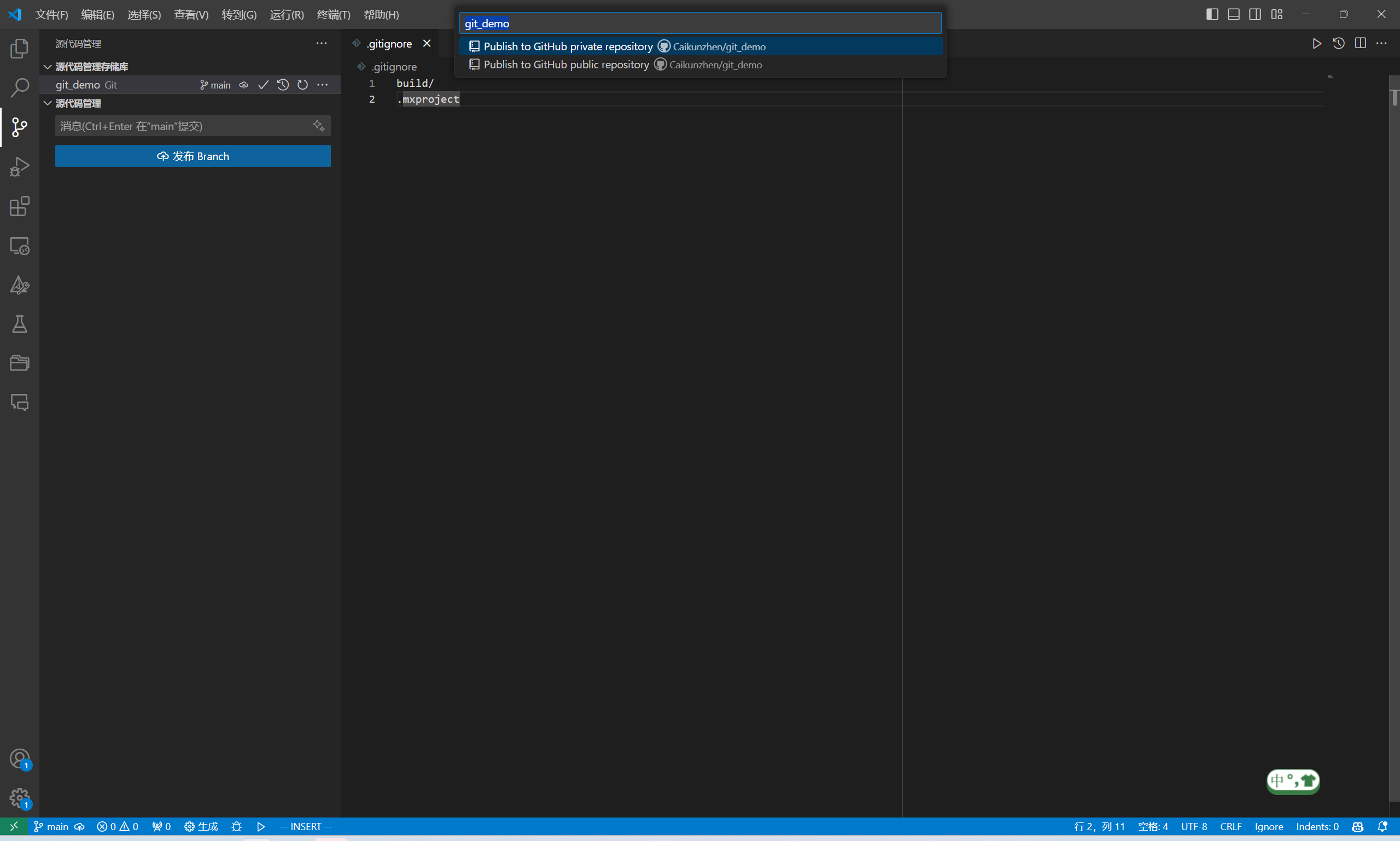 进一步点击"源代码管理储存库"栏目中的"发布分支"按钮,即可将本地厂库发布至远程厂库中。