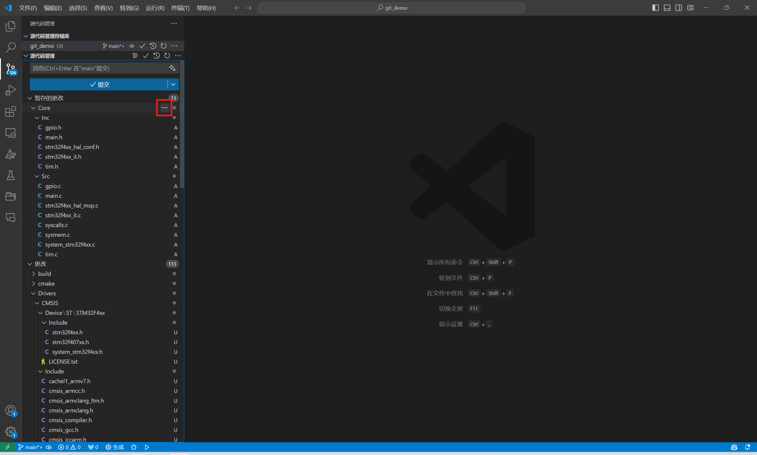 通过点击"更改"栏目中文件夹或文件右侧的"暂存更改"按钮,将修改添加到"暂存的更改"栏目中。