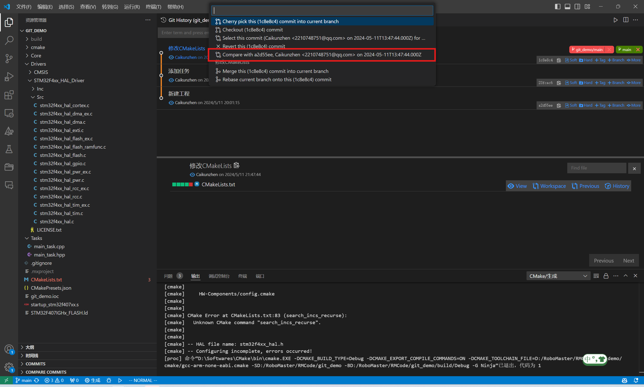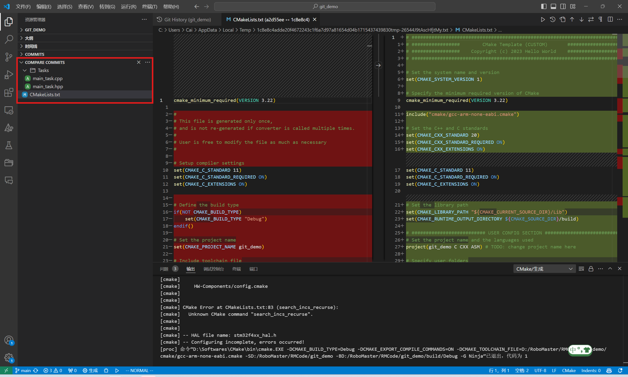此时左侧的资源管理器栏目中将多出 "COMPARE COMMITS" 栏目,其中将显示出此对比中发生改变的所有文件,点击想查看的文件则可观看两次提交的对比情况。