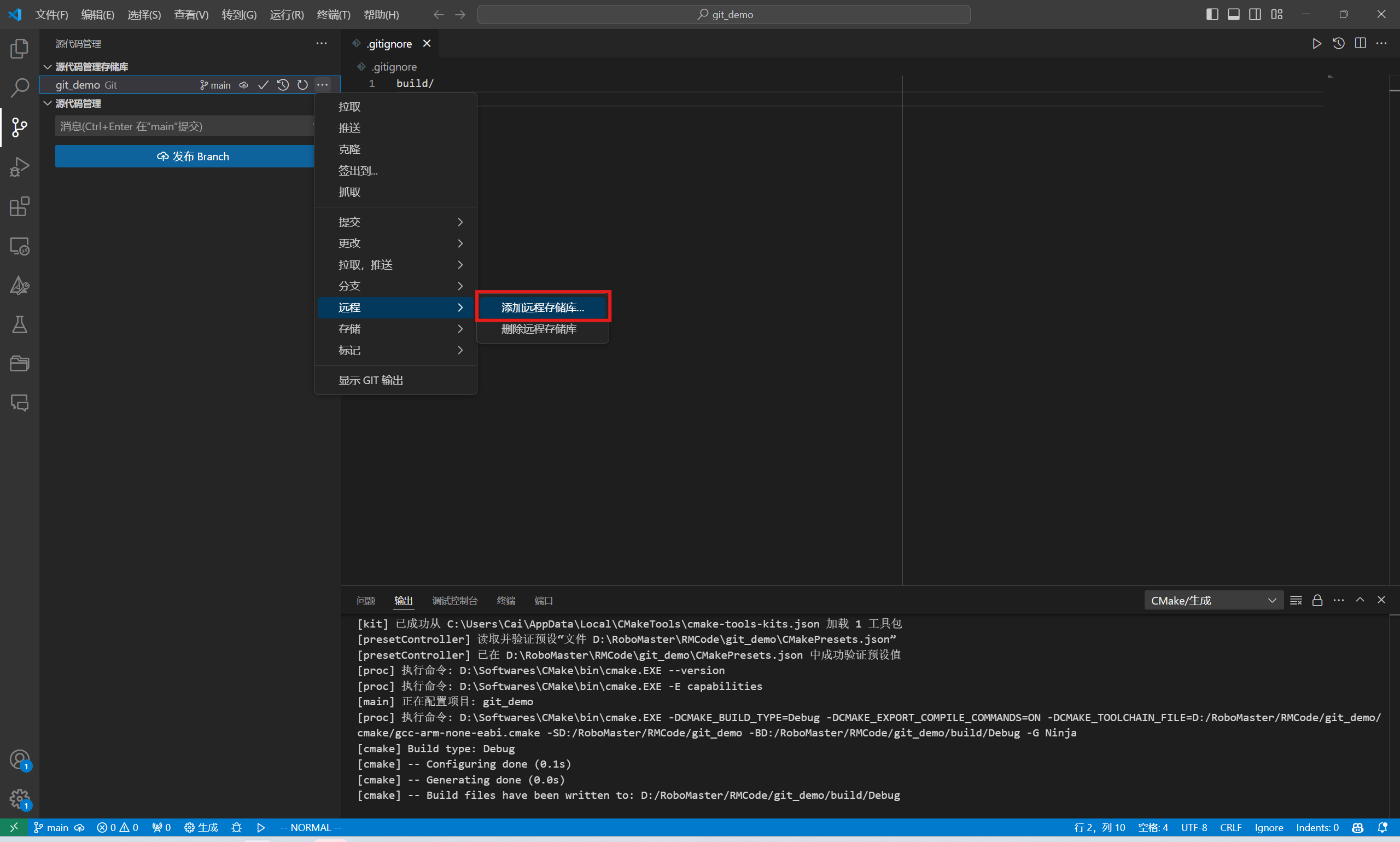 以该种方法创建的远程仓库将位于 GitHub 上个人的对应用户的仓库中,若计划将代码推送到指定远程厂库中则可在新建远程仓库后,点击"源代码管理储存库"栏目中的"远程" → "添加远程存储库"按钮,然后输入远程的 URL 并输入厂库名称后回车即可实现与远程仓库的关联。
