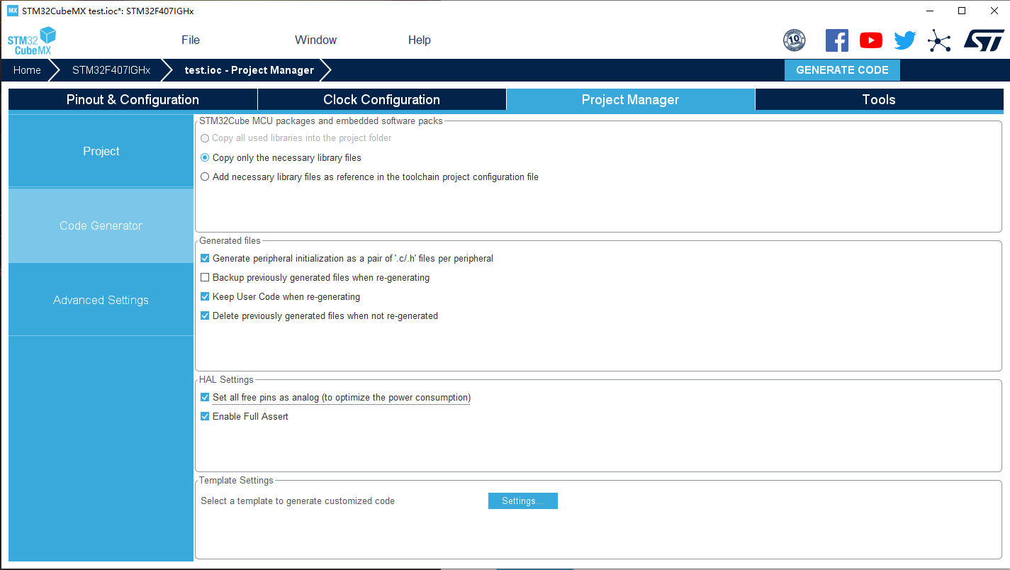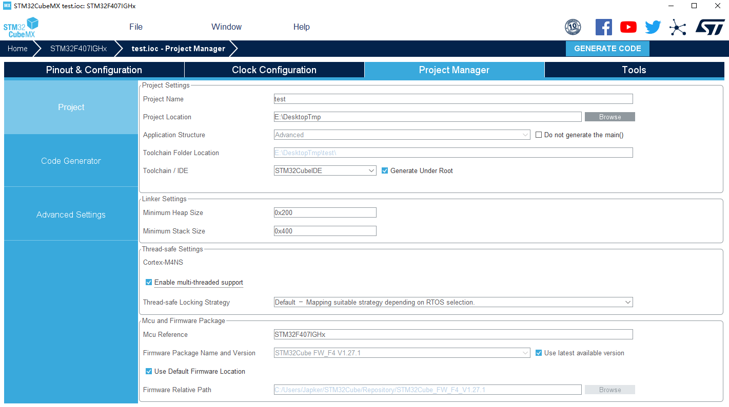 • 生成工程时,在 Project Manager-->Project-->Toolchain/IDE 选项选择 STM32CubeIDE,勾选 Generate Under Root;其它一些选项建议按下图选择。