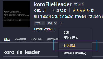 唤出键盘快捷方式菜单,搜索快捷键,共有两个:头部注释,命令 ID 为extension.fileheader