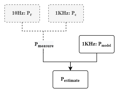 - 若底盘上未装有超级电容模块: \(\rm \mathbb P_r\) 量测(10Hz)与 \(\rm \mathbb P_{model}\)(1kHz)融合进行功率估计。