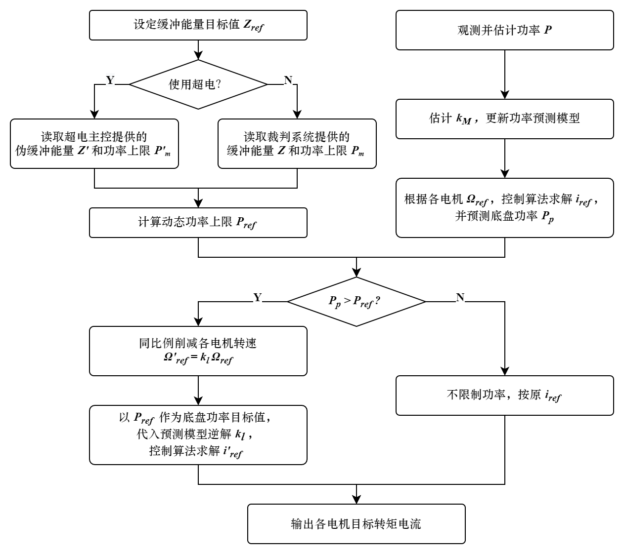 因此,底盘功率限制算法的目标是:在保证底盘运动可控的前提下,将底盘总功率(所有轮组叠加之和)限制在功率上限附近,并充分利用缓冲能量,实现底盘的平稳迅速启停、流畅运动,确保不受到底盘功率超限惩罚。
