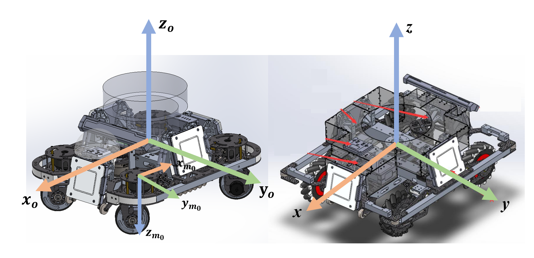 对于舵轮底盘,记轮组坐标系为 \(\{M_i\}\) ,其中\(i=1,2,3,4\),分别对应 front left (FL), back left (BL), back right (BR), front right (FR) 四组模块。以 FL 模块为例,其坐标系如图2左所示。实际解算过程中,还需要得到由 \(\{O\}\) 到 \(\{M_i\}\) 的旋转矩阵,记为 \({^{M_i}_O}R\) . 将该矩阵左乘于一向量 \(^OP\),可得到该向量在 \(\{M_i\}\) 中的描述: