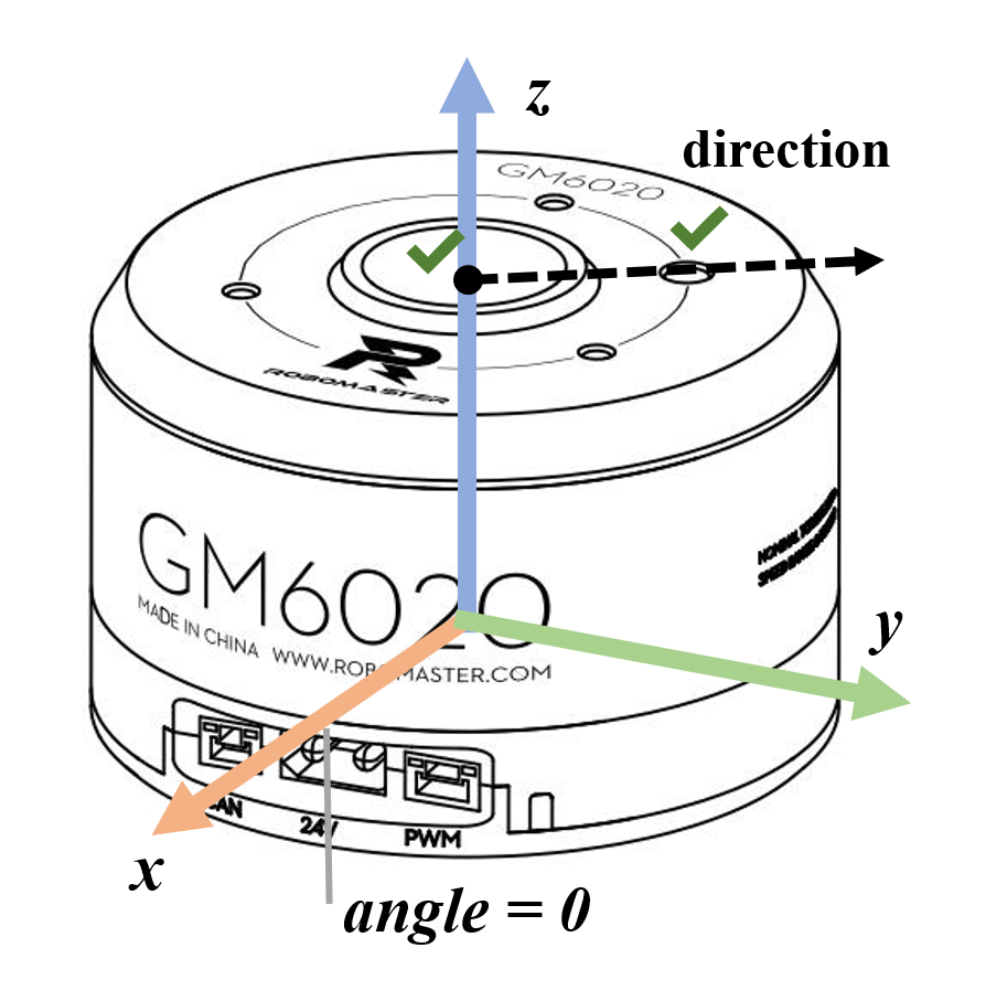 根据航向电机编码器的零位朝向,定义电机(定子)坐标系,转子朝向指向 \(x^+\)。