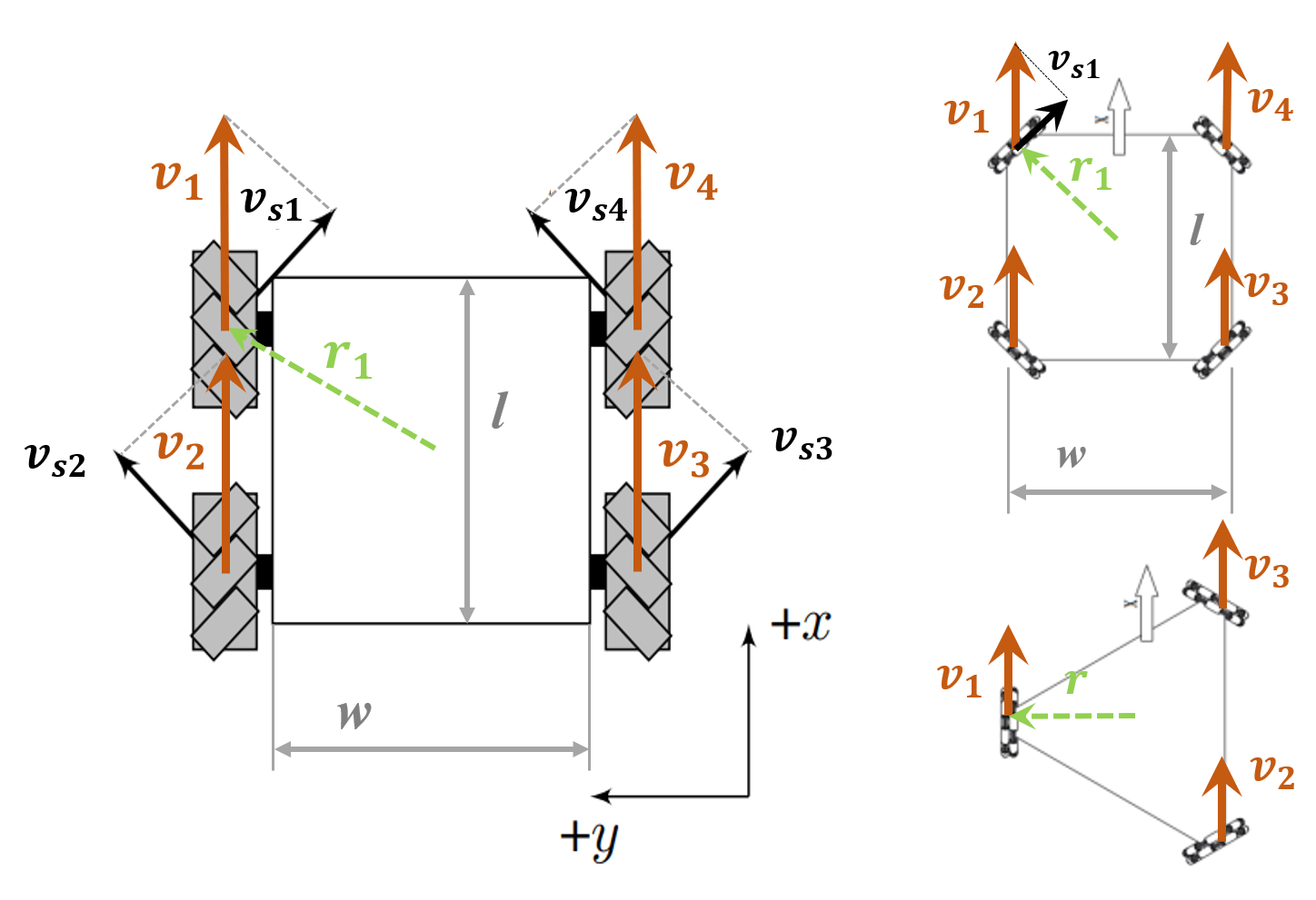 根据给定的底盘 \(x,y\) 方向上的目标平动速度分量和绕 \(z\) 轴的目标旋转角速度分量,经逆运动学解算,能够得出: