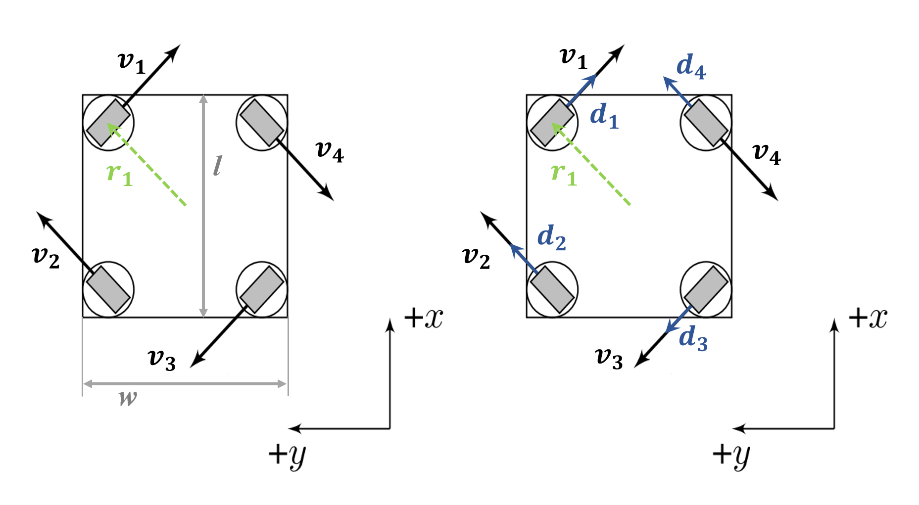 对每个舵轮轮组,用一个向量 \(\boldsymbol V_i\) 表征其运动状态(如图3左)。该向量指向航向电机的朝向,驱动轮转动方向与该朝向共线(可以正反转)。在不考虑优化的前提下,默认驱动轮转动方向与 \(\boldsymbol V_i\) 同向;向量的模长对应驱动轮线速率。