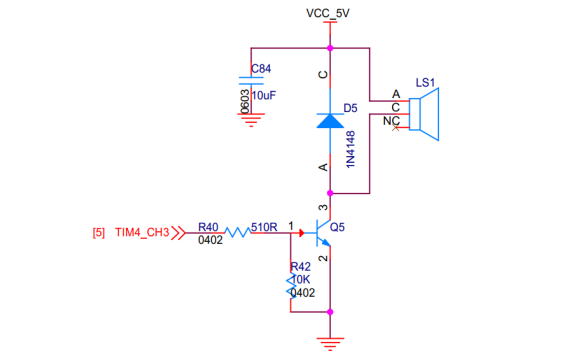 以 RoboMaster 开发板 C 型为例,使用的蜂鸣器为贴片型,原理图与实物图如下图所示: