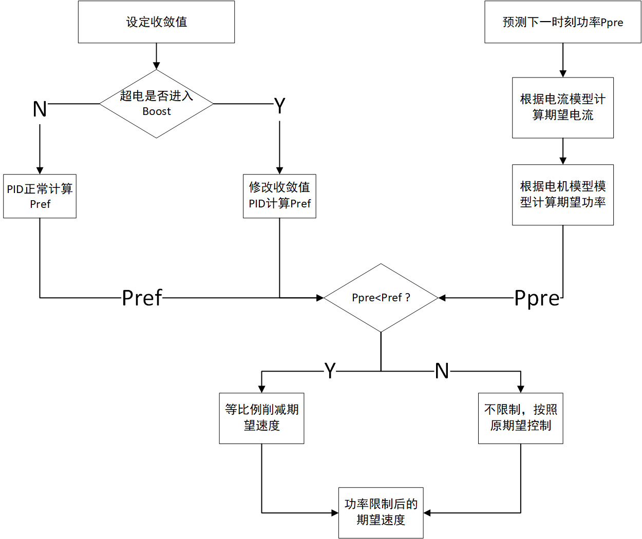 1.3.0版功率限制代码,其主要核心思想为通过预测下一时刻的功率\(P_{pre}\)与当前计算的动态功率上限\(P_{ref}\)进行比较求出适当的速度削减系数\(k_{l}\),等比例削减轮速,从而达到功率限制的效果。