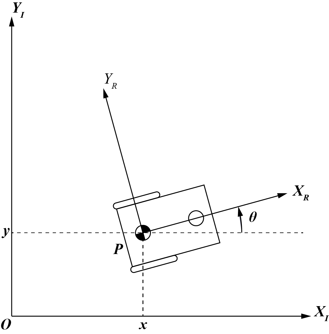 平面的全局坐标系和机器人的局部坐标系之间的关系如图所示。\(\hat{X}_I\) 和 \(\hat{Y}_I\) 定义了以平面上某点 \(O\) 为坐标原点的全局坐标系 \(\{ I \}\) 。为了指定机器人的位置,选择机器人底盘上的点 \(P\) 作为其位置参考点(通常为机器人底盘中心)。同样, \(\hat{X}_R\) 和 \(\hat{Y}_R\) 确定了以点 \(P\) 为原点的机器人局部坐标系 \(\{ R \}\) 。点 \(P\) 在全局坐标系的位置表达为 \(^IP_P={\begin{bmatrix} p_x & p_y &p_z\end{bmatrix}}^T\) ,姿态通过机器人局部坐标系在全局坐标系中的描述来表达,即