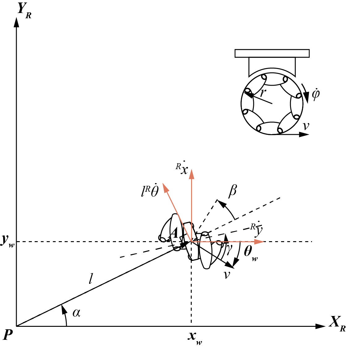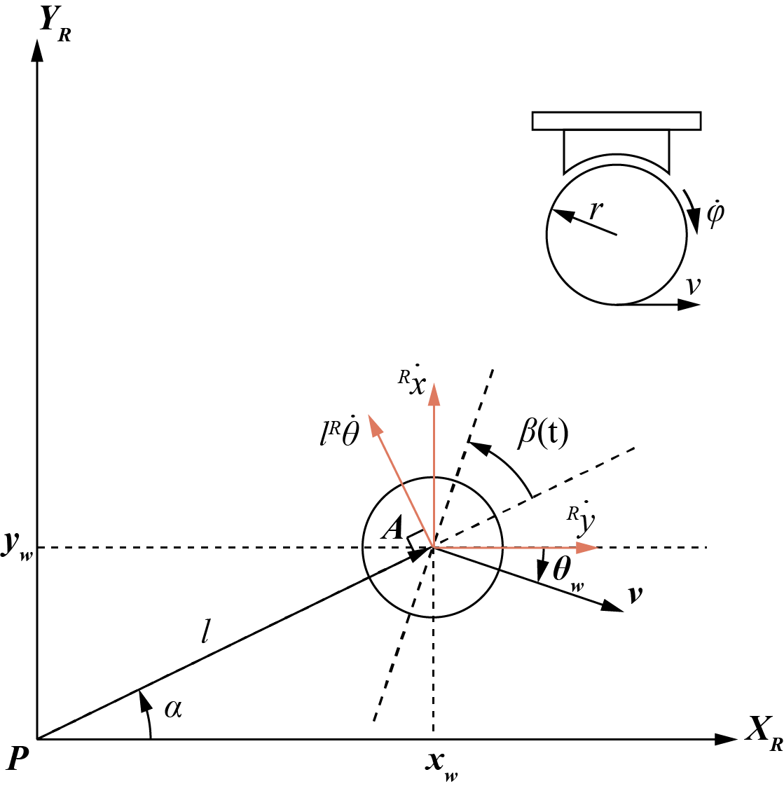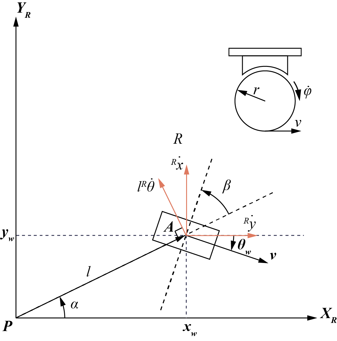 车轮在机器人局部坐标系下的位姿描述 \(^R\xi_w = {\begin{bmatrix} x_w & y_w & \theta_v \end{bmatrix}}^T\)