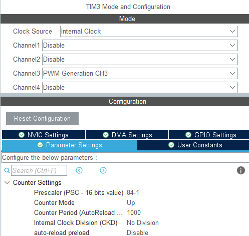- 对于 TIM3,查看数据手册可知其挂载在 APB1 总线上,时钟频率 84MHz,为达到 1kHz 的频率 ,可将预分频值(Prescaler)设置为 83,计数周期(Counter Period)设置为 999。